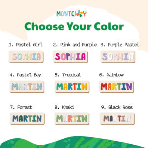 PERSONALIZED NAME PUZZLE: Our wooden puzzle can be customized with your child’s name and offers options for two or three lines. You have the option to choose from 18 different sets, each corresponding to a color palette for your baby’s name. Trust us, these colors have been carefully selected to ensure harmony and aesthetic appeal.
